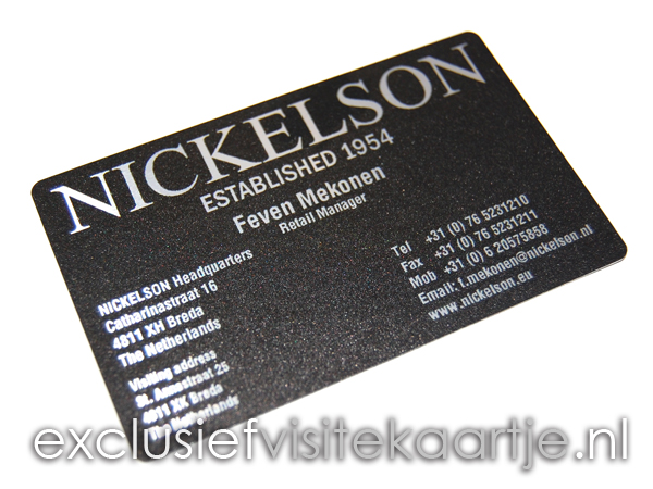 Deze aluminium visitekaartjes worden dekkend gedrukt. Dit wil zeggen dat alleen op de plekken waar geen bedrukking zit het aluminium naar boven komt. Door de dikke opdruk geeft het ook een soort reliëf en er is tevens witte bedrukking mogelijk.